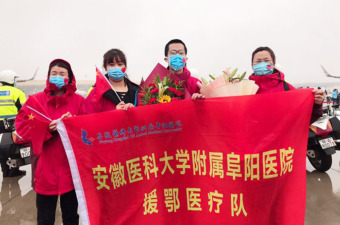 “大爱无疆情暖武汉人民,救灾抗疫尽显英雄本色。”临行前,医疗队队员们收到了武汉市东西湖区疫情防控指挥部送来的锦旗,以及武汉人民的热情欢送,大家高喊着“谢谢,辛苦了”以感谢医疗队为武汉抗击疫情的辛苦付出。抵达合肥新桥国际机场后,我校各直属附属医院相关负责人热情迎接了队员们并送上鲜花表示祝福。
