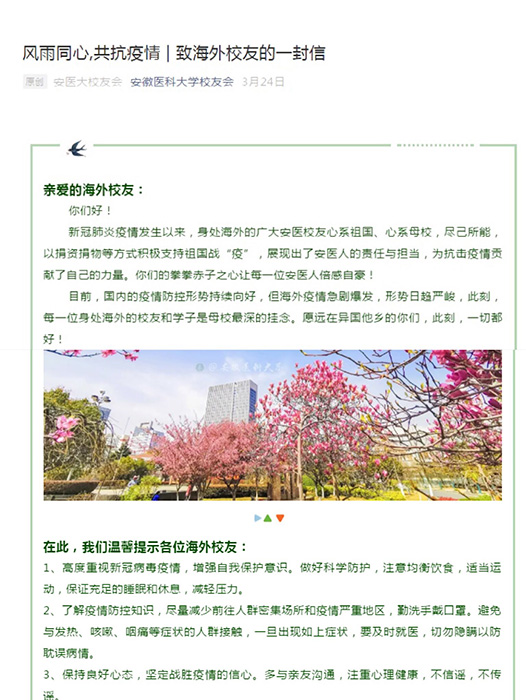 据悉,学校还通过官方网站、微信公众号等平台致信全体海外校友,表达对海外疫情的关注和对海外校友健康的关心,信中还附上详细联系方式,以便及时为校友提供帮助。