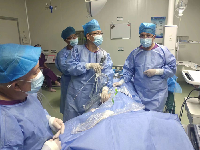 (图片说明 指导当地医护人员开展腹腔镜微创手术)