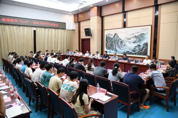 7月24日下午,学校召开临床医学“5+3”一体化专业学生座谈会。校党委书记王琦、校长翁建平出席座谈会并讲话,校党委副书记谢瑞瑾主持会议,副校长吕雄文出席座谈会。