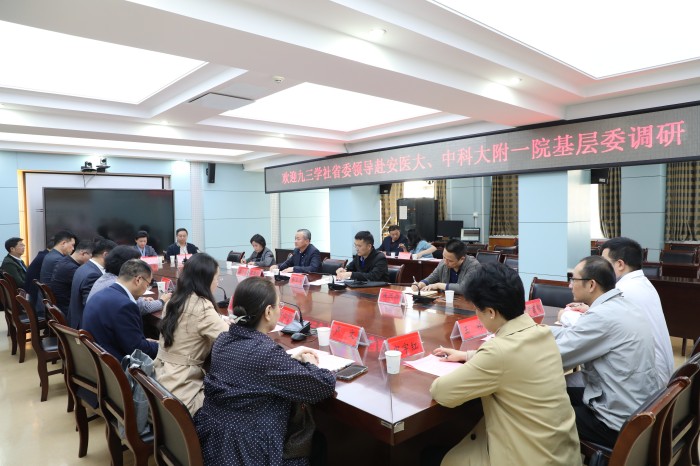 10月23日下午,九三学社安徽省委员会副主委、校长翁建平,九三学社安徽省委员会组织部副部长张自强,到九三学社安医大基层委走访调研。第一附属医院院长孙倍成,校党委常委、统战部部长顾秀平,安医大基层委主委、一附院副院长王珩,中国科学技术大学附属第一医院基层委主委何义富参加活动。