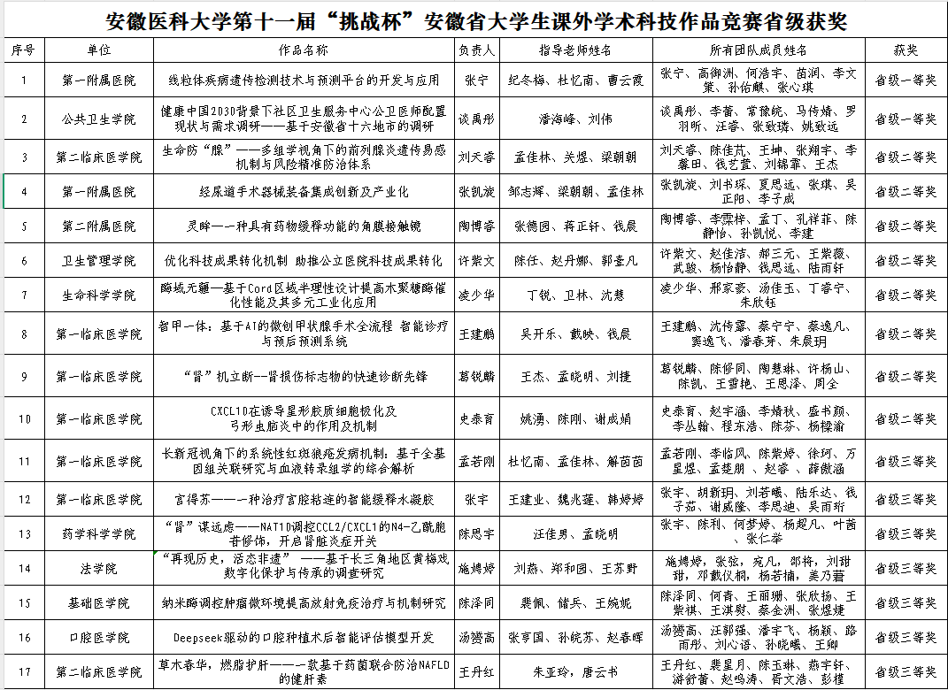 经过激烈角逐,我校第一临床医学院(第一附属医院)《线粒体疾病遗传检测技术与预测平台的开发与应用》、公共卫生学院《健康中国2030背景下社区卫生服务中心公卫医师配置现状与需求调研——基于安徽省十六地市的调研》2件作品获省级一等奖,第一临床医学院(第一附属医院)《经尿道手术器械装备集成创新及产业化、第二临床医学院(第二附属医院)《生命防“腺”——多组学视角下的前列腺炎遗传易感机制与风险精准防治体系》等8件作品获省级二等奖,第一临床医学院(第一附属医院)《新冠视角下的系统性红斑狼疮发病机制:基于全基因组关联研究与血液转录组学的综合解析》等7件作品获省级三等奖。