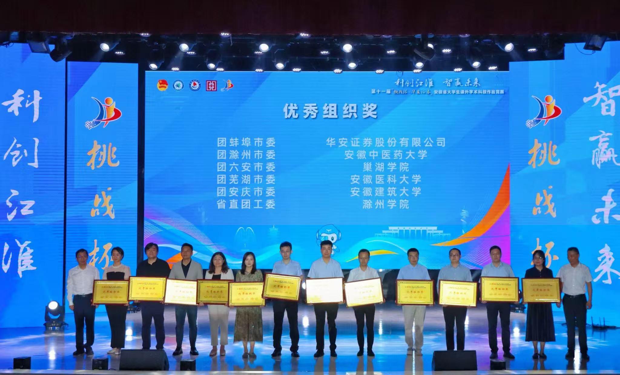 6月16日,团省委正式公布第十一届“挑战杯·华安证券”安徽省大学生课外学术科技作品竞赛省级获奖名单,我校作品共获奖项18个,其中一等奖2项、二等奖8项、三等奖7项,学校获“优秀组织奖”。比赛当天,校党委常委、副校长邱志海代表学校赴决赛现场看望慰问参赛团队师生。