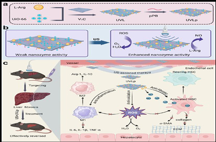 肝纤维化是肝损伤后自我修复的慢性动态可逆病理过程,是发展成肝硬化和肝癌的必经阶段,目前临床缺乏有效逆转手段。针对纤维化肝组织中活性氧(ROS)过度累积这一核心机制,王啸教授团队成功开发了一种新型超声响应型双纳米酶系统(UVLp),由UiO-66和V₂C纳米酶构成,负载L-精氨酸(L-Arg)并修饰靶向肽pPB,可特异性识别并富集于活化的肝星状细胞(aHSCs)。在超声(US)激活下,纳米酶催化效率显著提升,同步实现高效ROS清除和一氧化氮(NO)可控释放。所产生的NO转化为过氧亚硝酸盐(ONOO⁻),可激活基质金属蛋白酶(MMPs),促进过度沉积的细胞外基质(ECM)降解。